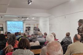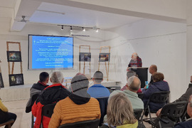 Исперих (17 октомври 2025) Нови открития и любопитни факти от теренните проучвания на пещерите в Археологическия резерват „Сборяново“ и Държавното ловно стопанство „Воден – Ири Хисар“ бяха представени на среща в Исперих. На снимката: почетният президент на Балканския спелеоложки съюз Алексей Жалов.