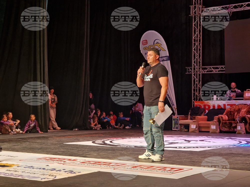 Разград (18 март 2025) Брейк танцьори от девет клуба от страната демонстрират уменията си на Държавно първенство в Разград. Турнирът се провежда за пета поредна година, а за трети път е част от държавния шампионат по брейк. Негови организатори са разградският клуб по брейк „Shadows Crew“, Българската федерация по брейк и Община Разград, с подкрепата на множество спонсори. На снимката: кметът на Община Разград Добрин Добрев (вляво).