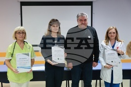 Русе (21 октомври 2025) Трима лекари и един от екипите на Университетската многопрофилна болница за активно лечение (УМБАЛ) „Канев“ в Русе бяха отличени в инициативата „Златни ръце, добро сърце“ на лечебното заведение. Те получиха специални грамоти и плакети от изпълнителния директор на болницата Иван Иванов (вляво). На снимката: д-р Йонка Костова.