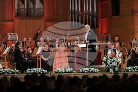 София (26 октомври 2025) В Концертен комплекс „България“ се провежда заключителен галаконцерт и награждаване на победителите в Международния конкурс за млади оперни певци „Опералия 2025". Престижният конкурс гостува за първи път у нас в периода от 20 до 26 октомври. Организатор е SY11 Events. Членове на журито са представители на оперни театри от Испания, Нидерландия, Германия, Австрия, Великобритания, Италия, САЩ, Белгия. На снимката: основателят на конкурса Пласидо Доминго (в средата).