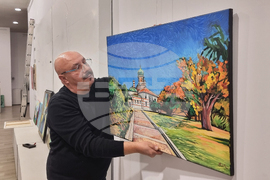 Плевен (5 ноември 2024) В Арт център - 1 в Плевен се подготвя традиционната изложба на Дружеството на плевенските художници - Есенен салон. Тази година в него участват 52-ма автори. Откриването е утре вечер. На снимката: председателят на Дружеството на плевенските художници Николай Неделчев-Кокала участва в подреждането на изложбата.