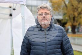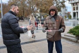 Бургас (21 ноември 2024) Представители на Регионална здравна инспекция (РЗИ) Бургас провеждат информационна кампания пред сградата на Културен дом "НХК". Инициативата е по повод Международния ден без тютюнопушене - 21 ноември. На снимката: старши инспекторът към РЗИ Бургас Венцислав Хаджиилиев.