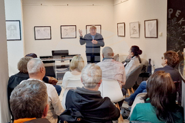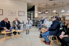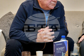 Свищов (21 ноември 2024) Писателят Николай Табаков представя новата си книга „Концерт за жаби и оркестър в ми бемол мажор” в Хъб за идеи и култура в Свищов. В нея също участват поетът Божидар Богданов (на снимката) заедно с пианистката Лили Йорданова. Срещата се организира от Сдружение с нестопанска цел „Рисувай с нас”, съвместно с Градска библиотека „Проф. Иван Шишманов”.