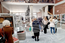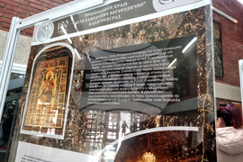 Благоевград (21 ноември 2024) С изложба от ценни експонати и с тематични четения Регионалният исторически музей (РИМ) в Благоевград отбелязва 180 години от построяването на катедралния храм „Свето Въведение Богородично” в града. Поздрав по повод празничния ден бяха подготвили учениците от Осмо средно училище „Арсени Костенцев” в града. На снимката: полковата икона на 14-ти пехотен Македонски полк с образа на Свети Седмочисленици.