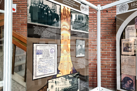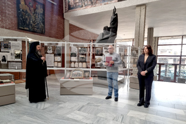 Благоевград (21 ноември 2024) С изложба от ценни експонати и с тематични четения Регионалният исторически музей (РИМ) в Благоевград отбелязва 180 години от построяването на катедралния храм „Свето Въведение Богородично” в града. Поздрав по повод празничния ден бяха подготвили учениците от Осмо средно училище „Арсени Костенцев” в града. На снимката (от ляво надясно): Негово Високопреосвещенство Неврокопски митрополит Серафим, директорът на РИМ - Благоевград д-р Кирил Алексиев и уредникът в музея и организатор на изложбата д-р Елена Чалгънова.