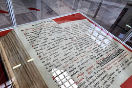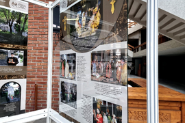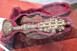 Благоевград (21 ноември 2024) С изложба от ценни експонати и с тематични четения Регионалният исторически музей (РИМ) в Благоевград отбелязва 180 години от построяването на катедралния храм „Свето Въведение Богородично” в града. Поздрав по повод празничния ден бяха подготвили учениците от Осмо средно училище „Арсени Костенцев” в града. На снимката: стоящ кръст, направен от чимширово дърво, сребро и злато, който се съхранява в църквата „Свето Въведение Богородично”.
