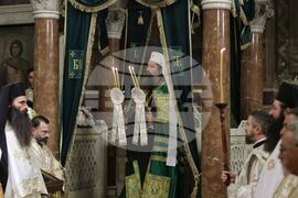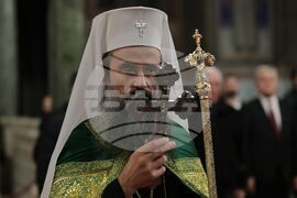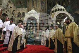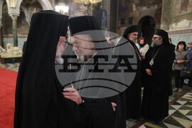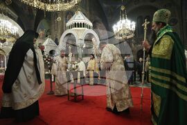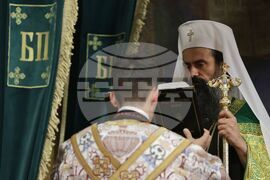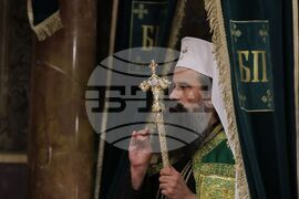 София (22 ноември 2024) Българската православна църква (БПЦ) отбелязва тържествено изпълването на 100 години от освещаването на патриаршеския ставропигиален храм-паметник "Св. Александър Невски". По този повод у нас пристигат делегации на всички Поместни православни църкви, за да съучастват в празника на родната ни Църква. В храма се провежда вечерно богослужение с петохлебие. На снимката: Българският патриарх и Софийски митрополит Даниил..