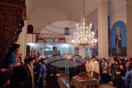 Тервел (22 ноември 2024) Миряните в Тервел посрещнаха честният пояс на Пресвета Богородица в храм "Св. Георги". Светинята бе донесена от Доростолския митрополит Яков (в средата). Свещеници от околията отслужват Вечерня.