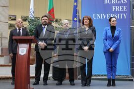 Бургас (27 ноември 2024) Бургаският свободен университет (БСУ) провежда ден на отворените врати. Инициативата е насочена към всички ученици, кандидат-студенти и родители, които желаят да се запознаят с възможностите за образование предлагани от университета. На снимката (от ляво надясно): сред официалните гости на събитието са проф. д-р Спартак Керемеджиев, генералният директор на БТА Кирил Вълчев, зам.-кметът по Образование, здравеопазване и младежки политики на Община Бургас Михаил Ненов, областният управител на Бургас проф. д-р Мария Нейкова и пом.-ректорът на БСУ Дарина Димитрова.