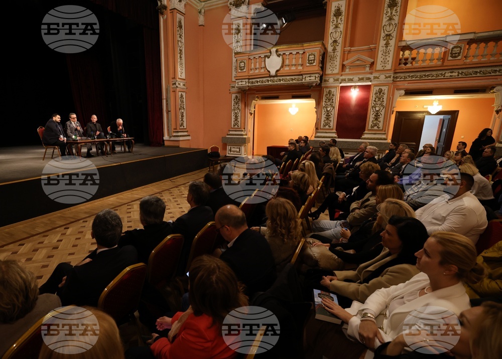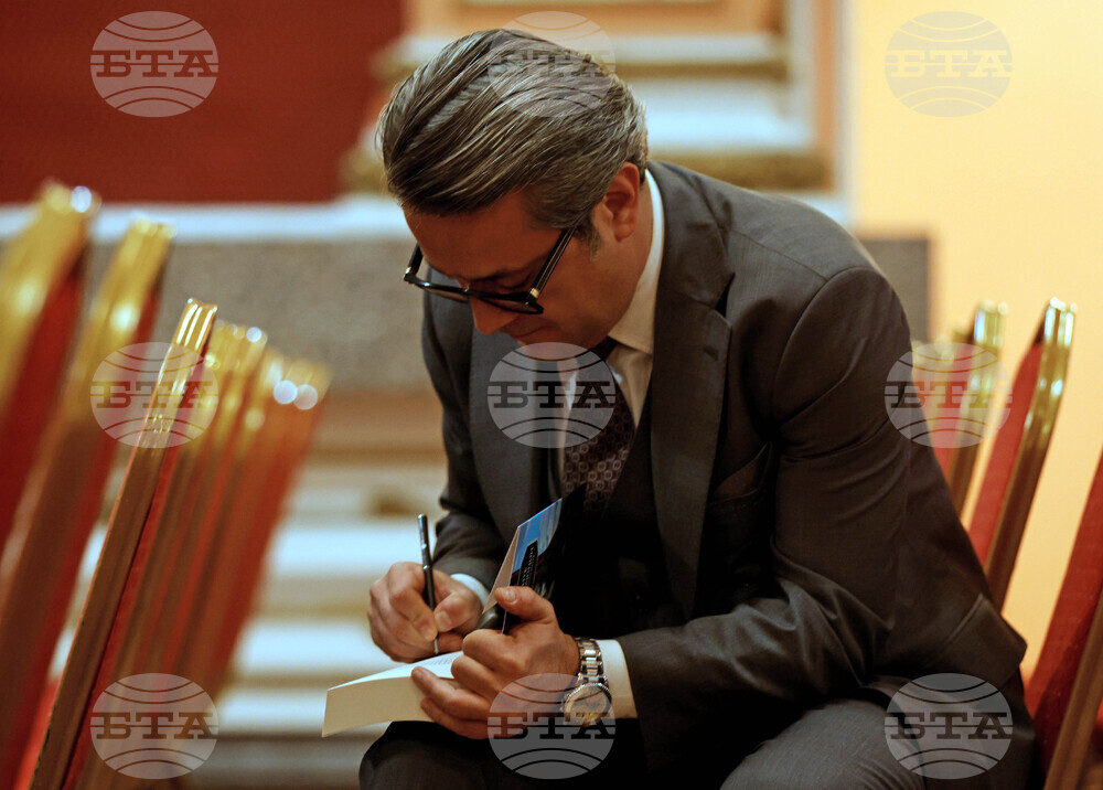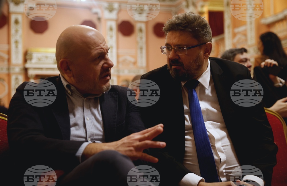 София (27 ноември 2024) Депутатът от ГЕРБ-СДС Тома Биков представя новата си книга „Българските контрареволюции и краят на идеологиите“ във Военния клуб в София. Творбата е издадена от A&T Publishing. Тя е продължение на предишната книга на Тома Биков - „Българските революции“, която излезе преди близо четири години. На снимката: депутатът от ГЕРБ-СДС Томислав Дончев (вляво) и генералният директор на БТА Кирил Вълчев.