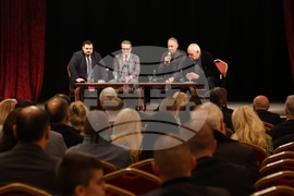 София (27 ноември 2024) Депутатът от ГЕРБ-СДС Тома Биков представя новата си книга „Българските контрареволюции и краят на идеологиите“ във Военния клуб в София. Творбата е издадена от A&T Publishing. Тя е продължение на предишната книга на Тома Биков - „Българските революции“, която излезе преди близо четири години. На снимката (от ляво надясно): депутатът от ГЕРБ-СДС и автор на книгата Тома Биков, телевизионният водещ Димитър Стоянович, социологът Андрей Райчев, Петър Николов.