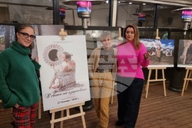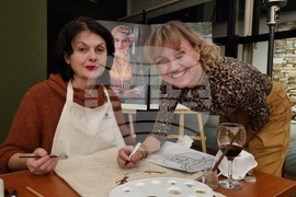 Скопие (27 ноември 2024) Работилница под надслов "В света на изкуството" се проведе тази вечер в Българския Културно-информационен Център (БКИЦ) в Скопие, Северна Македония. Актрисата Гергана Змийчарова проведе учение за рисуване върху торбички. На снимката: директорът на БКИЦ-Скопие Антония Велева (вдясно), актрисата Гергана Змийчарова (втората отдясно).