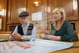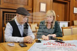 Бургас (5 декември 2024) Композиторът Стефан Диомов провежда пресконференция в заседателната зала на Община Бургас. Поводът е предстоящият двоен Коледен концерт спектакъл. На снимката: композиторът Стефан Диомов и зам.-кметът по Култура и вероизповедания на Община Бургас Диана Саватева.