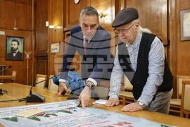 Бургас (5 декември 2024) Композиторът Стефан Диомов провежда пресконференция в заседателната зала на Община Бургас. Поводът е предстоящият двоен Коледен концерт спектакъл. На снимката (от ляво надясно): кметът на Община Бургас Димитър Николов, композиторът Стефан Диомов.