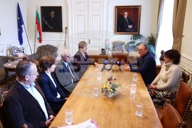 София (9 декември 2024) Церемония по встъпването в длъжност на новоизбрания председател на Българската академия на науките чл.-кор. Евелина Славчева (четвърта отляво) се провежда в БАН. На снимката: акад. Юлиан Ревалски (втори отдсно).