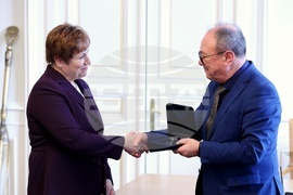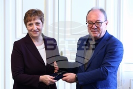 София (9 декември 2024) Церемония по встъпването в длъжност на новоизбрания председател на Българската академия на науките чл.-кор. Евелина Славчева (вляво) се провежда в БАН. На снимката: акад. Юлиан Ревалски (вдясно) предава символично ключа на Академията на чл.-кор. Евелина Славчева, която бе избрана за председател на БАН на 2 декември.