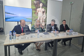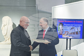 Петрич (9 декември 2024) Дискусия на тема „Долината на Струма” се провежда в Историческия музей в Петрич. В обсъждането на форума е и темата за Хераклея Синтика - представена като новото чудо на Балканите, както и чудесата на Пиринско, които предоставят възможност за културни и туристически маршрути и продукти на балканските страни. На снимката: ръководителят на разкопките в античния град Хераклея Синтика проф. Людмил Вагалински (вляво), служебният министър на културата Найден Тодоров.