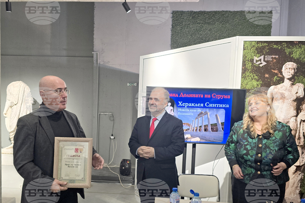 Петрич (9 декември 2024) Дискусия на тема „Долината на Струма” се провежда в Историческия музей в Петрич. В обсъждането на форума е и темата за Хераклея Синтика - представена като новото чудо на Балканите, както и чудесата на Пиринско, които предоставят възможност за културни и туристически маршрути и продукти на балканските страни. Служебният министър на културата Найден Тодоров удостои професор Людмил Вагалински с грамота „Пазител на наследството”. Професорът е отличен заради значимите открития в античен град „Хераклея Синтика” тази година. На снимката (от ляво надясно): професор Людмил Вагалински, служебният министър на културата Найден Тодоров, главният редактор на медия „Стандарт” и председател на общество „Културно наследство” Славка Бозукова.