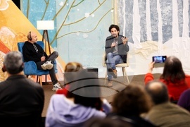 София (10 декември 2024) Петдесет и първото издание на Софийския международен панаир на книгата се провежда в Националния дворец на културата (НДК). На снимката: среща с писателя Мигел Бонфоа (вдясно). Модератор на разговора е Георги Тошев (вляво).