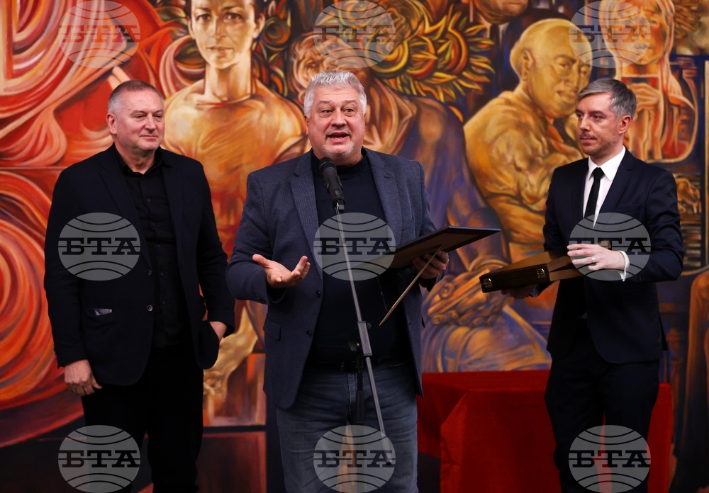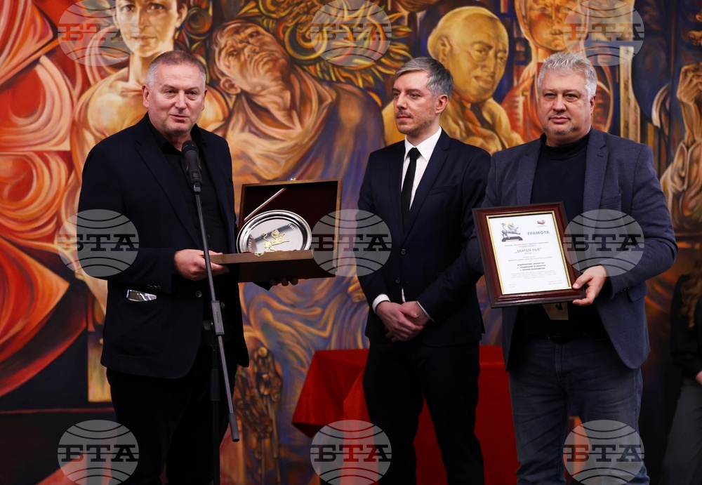 София (10 декември 2024) Откриване на Петдесет и първия Софийски международен панаир на книгата се провежда в зала 7 на Националния дворец на културата (НДК). Отличието за издателски проект с най-голяма обществена значимост се присъжда на „Градинарят и смъртта” на Георги Господинов (вляво) от Издателство „Жанет 45” - Красимир Лозанов (в средата).
