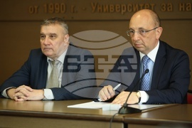 София (12 декември 2024) Президентът на Българската Си Еф Ей (CFA) асоциация и изпълнителен директор на „Експат Асет Мениджмънт" Николай Василев (вдясно) изнася публична лекция на тема „Бюджетна и икономическа политика на българската държава" в зала „Тържествена" на УНСС. В събитието участва ректорът на УНСС проф. д-р Димитър Димитров (вляво).
