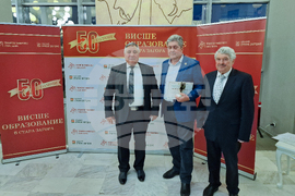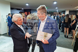 Стара Загора (12 декември 2024) С тържествено честване в залата на Държавната опера в Стара Загора бяха отбелязани 50 години висше образование в града. Събитието се организира от Тракийски университет - Стара Загора и Община Стара Загора и е под патронажа на президента на Република България Румен Радев. На снимката: генералният директор на БТА Кирил Вълчев (вдясно) беше отличен за значителна медийна подкрепа за висшето образование в Стара Загора.