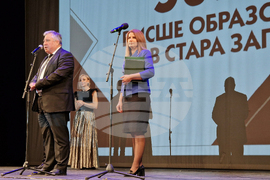 Стара Загора (12 декември 2024) С тържествено честване в залата на Държавната опера в Стара Загора бяха отбелязани 50 години висше образование в града. Събитието се организира от Тракийски университет - Стара Загора и Община Стара Загора и е под патронажа на президента на Република България Румен Радев. На снимката: ректорът на Тракийския университет в Стара Загора проф. Добри Ярков и заместник-кметът на Община Стара Загора Милена Желева.