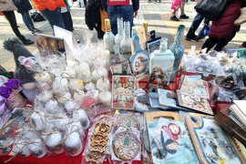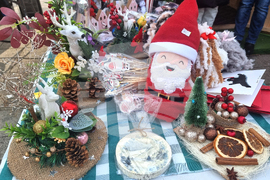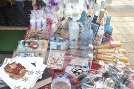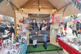 Плевен (14 декември 2024) В Плевен започна благотворителен базар в подкрепа на неправителствената организация „Дом за бездомничета”. Той е разположен в една от къщичките в Коледното градче на централния площад „Възраждане”. Изложени са ръчно изработени коледни сувенири, дарени от съмишленици на организацията, книги и красиви издания за дома. Със събраните средства ще бъде подкрепена каузата на „Дом за бездомничета” - да помагат за лечението и кастрацията на бездомни животни. На снимката: Жени Костадинова и Поля Мартинова посрещат плевенчани на благотворителния базар.