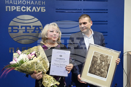 Плевен (18 декември 2024) В Националния пресклуб на БТА в Плевен връчиха годишните награди за журналистика „Северно ехо“. Те се организират традиционно в края на всяка календарна година от Дружеството на журналистите в града и Община Плевен. На снимката: Голямата награда за журналистика „Северно ехо“ за 2024 година бе присъдена на програмния ръководител на Общинско радио и главен редактор на вестник „Левски днес“ Любка Христова. Връчи й я областният управител Николай Абрашев.