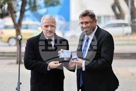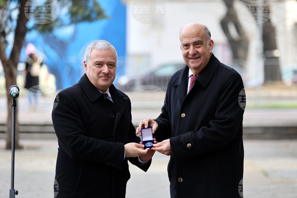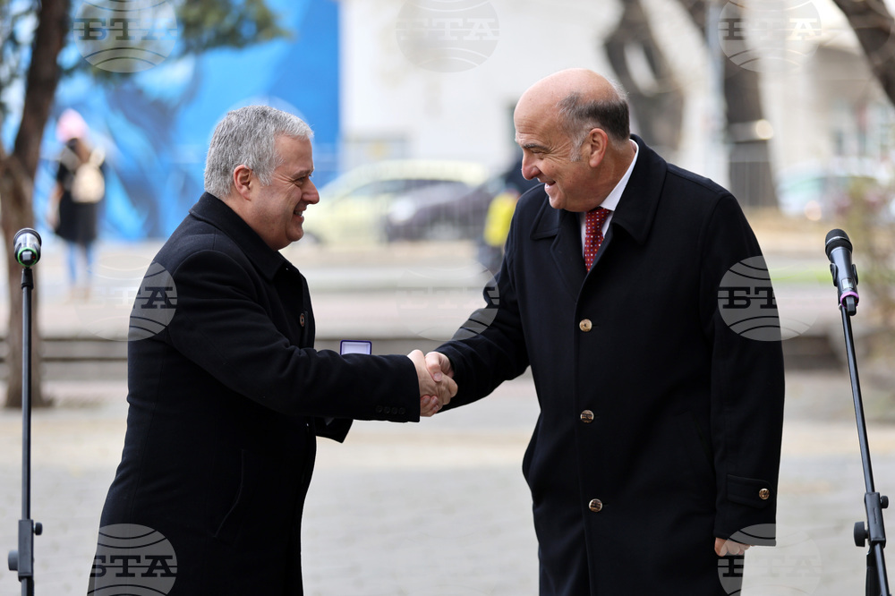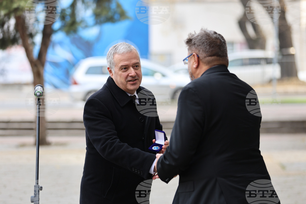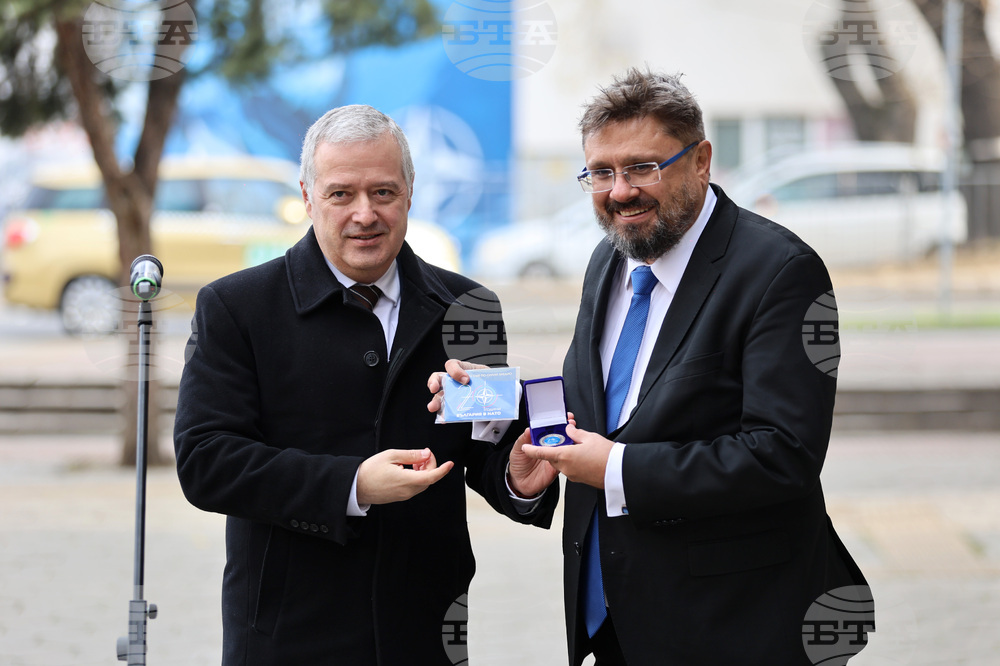 Пловдив (20 декември 2024) Министерството на външните работи на Република България, в партньорство с Община Пловдив, откри стрийт-арт проект в град Пловдив, посветен на 20-ата годишнина от членството на страната ни в НАТО. Той се намира пред сградата на трафопост „Орта Мезар“ на бул. „6-и септември“ № 142. На снимката: служебният министър на външните работи Иван Кондов връчва юбилейният медал на Министерството на външните работи по случай 20-ата годишнина от присъединяването на България към НАТО на генералния директор на БТА Кирил Вълчев (вдясно).