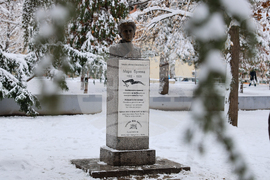 Благоевград (13 януари 2025) С полагане на цветя пред бюст-паметника на Мара Бунева, в Благоевград се отбелязва 97 години от смъртта на българската революционерка. На снимката: директорът на Регионалния исторически музей в Благоевград д-р Кирил Алексиев.