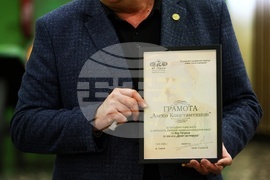 София (13 януари 2025) Резултатите от конкурса за камерна сатирично-комедийна пиеса за наградата „Алеко Константинов“ се обявяват на пресконференция, която се провежда в централното фоайе на Сатиричния театър „Алеко Константинов”. На снимката: актьорът Ивайло Калоянчев.