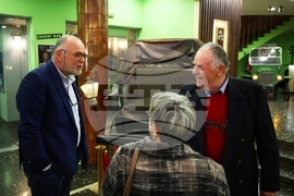 София (13 януари 2025) Резултатите от конкурса за камерна сатирично-комедийна пиеса за наградата „Алеко Константинов“ се обявяват на пресконференция, която се провежда в централното фоайе на Сатиричния театър „Алеко Константинов”. На снимката: актьорът Ивайло Калоянчев (вдясно) и Явор Калоянчев - син на Георги Калоянчев.