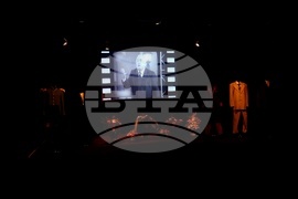 София (13 януари 2025) В Камерната зала „Методи Андонов“ на Сатиричния театър "Алеко Константинов" се честват 100 години от рождението на актьора Георги Калоянчев. На снимката: прожекция на филма за Георги Калоянчев „Умно село: Възгледите на един Homo Ludens“.