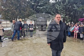 Раднево (15 януари 2025) С тържествено поднасяне на венци и цветя пред паметника на Гео Милев в Раднево се отбелязва 130-годишнината от рождението на поета и публицист. На снимката: кметът на Община Раднево Георги Петров по време на тържественото поднасяне на венци и цветя пред паметника на Гео Милев в града.