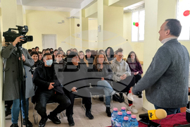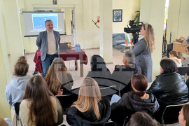 Перник (17 януари 2025) Среща с доц. Милен Иванов (вляво) се провежда в Шесто Средно училище „Св. св. Кирил и Методии” в Перник. Повод за нея е наближаващият фестивал на маскарадните игри „Сурва” и традицията по отбелязването на празника в училището. В проявата участват ученици от гимназиален етап. Гостът разказа интересни подробности свързани с живота на древните българи, нулевият ден в българския календар, зимното слънцестоене, смисълът на имената и др.