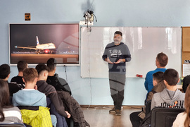 София (20 януари 2025) Столичното 127 СУ „Иван Н. Денкоглу" е домакин на изложба, представяща творби на ученици, занимаващи се с авиационна фотография. Идеята на организаторите е да събудят интереса към авиацията като възможност за професионално развитие. На снимката: Милен Димов, авиационен фотограф и организатор на инициативата.