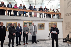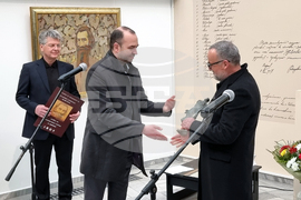 Кюстендил (1 февруари 2025) Богдан Александров е носителят на Националната награда за живопис на името на Майстора. Той беше обявен днес на официална церемония в художествената галерия „Владимир Димитров - Майстора” в Кюстендил. Наградата се връчва всяка година на рождения ден на големия български художник. На снимката: кметът на Кюстендил Огнян Атанасов.