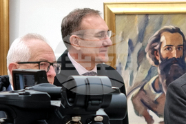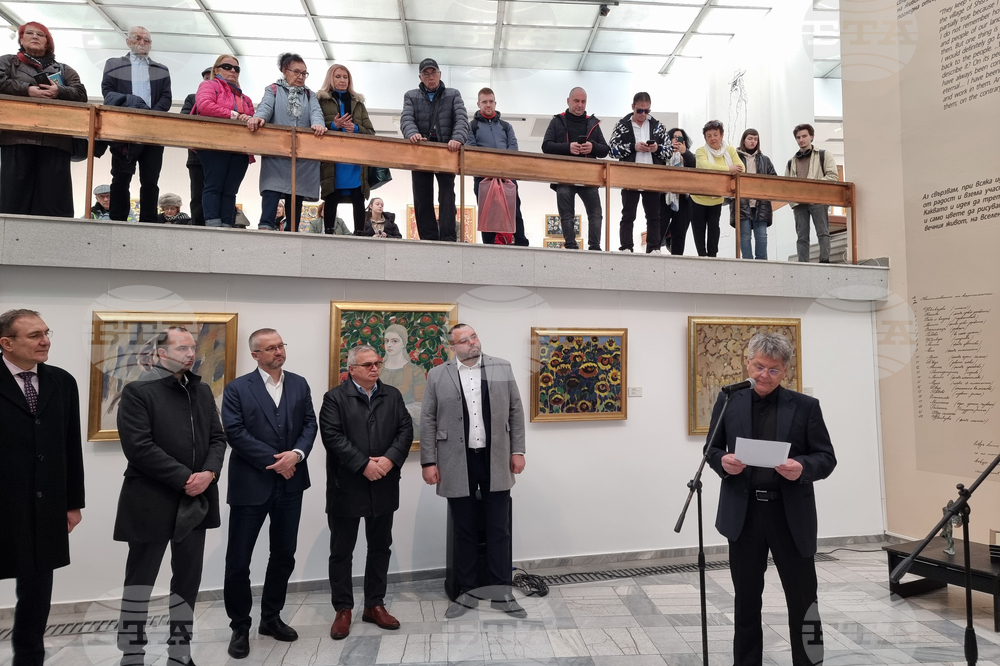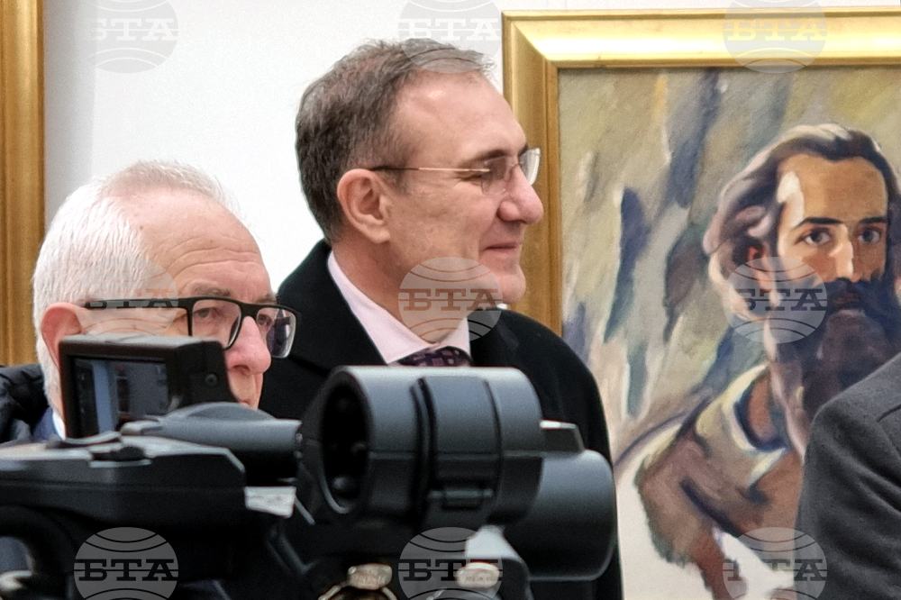 Кюстендил (1 февруари 2025) Богдан Александров е носителят на Националната награда за живопис на името на Майстора. Той беше обявен днес на официална церемония в художествената галерия „Владимир Димитров - Майстора” в Кюстендил. Наградата се връчва всяка година на рождения ден на големия български художник. На снимката: министърът на труда и социалната политика Борислав Гуцанов.