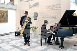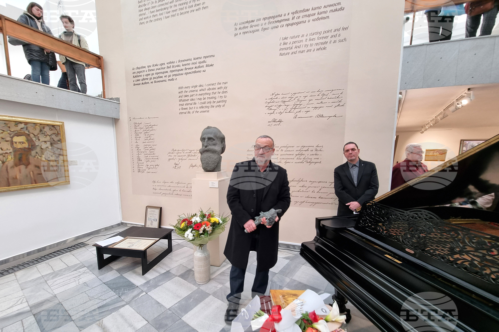 Кюстендил (1 февруари 2025) Богдан Александров е носителят на Националната награда за живопис на името на Майстора. Той беше обявен днес на официална церемония в художествената галерия „Владимир Димитров - Майстора” в Кюстендил. Наградата се връчва всяка година на рождения ден на големия български художник. На снимката: пред паметника на Майстора пред галерията в Кюстендил бяха поднесени цветя.