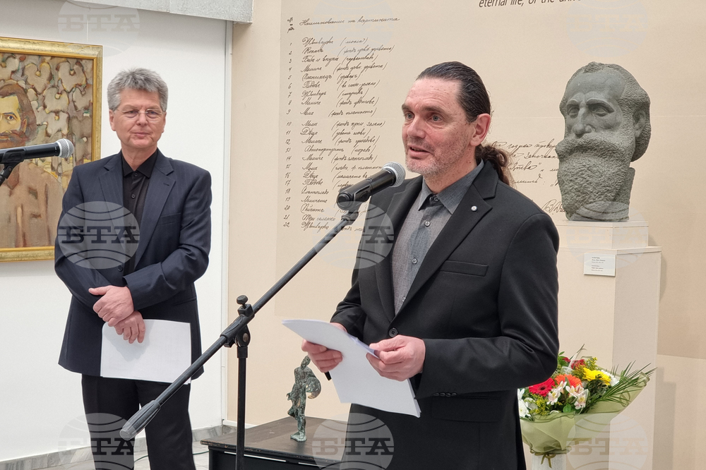 Кюстендил (1 февруари 2025) Богдан Александров (вляво) е носителят на Националната награда за живопис на името на Майстора. Той беше обявен днес на официална церемония в художествената галерия „Владимир Димитров - Майстора” в Кюстендил. Наградата се връчва всяка година на рождения ден на големия български художник.