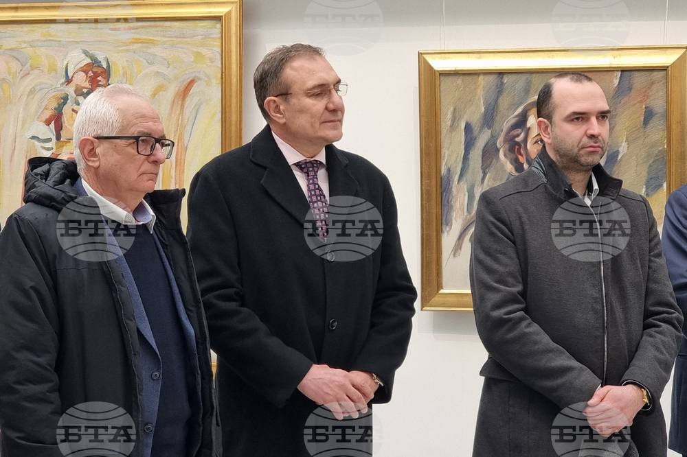 Кюстендил (1 февруари 2025) Богдан Александров е носителят на Националната награда за живопис на името на Майстора. Той беше обявен днес на официална церемония в художествената галерия „Владимир Димитров - Майстора” в Кюстендил. Наградата се връчва всяка година на рождения ден на големия български художник. На снимката: Александър Пандурски, министърът на труда и социалната политика Борислав Гуцанов и Огнян Атанасов.