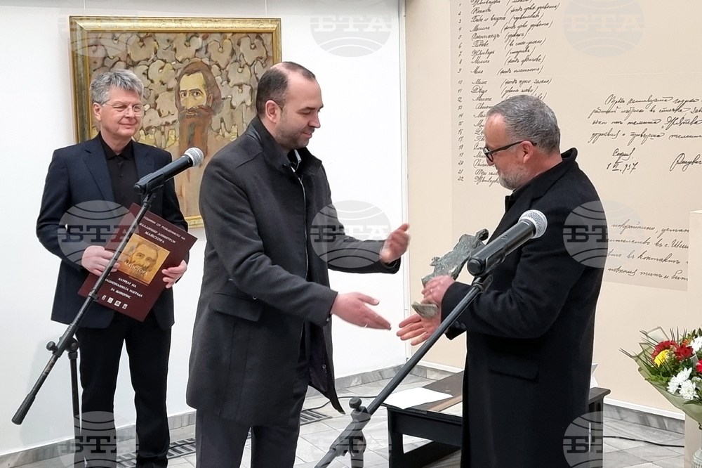 Кюстендил (1 февруари 2025) Богдан Александров е носителят на Националната награда за живопис на името на Майстора. Той беше обявен днес на официална церемония в художествената галерия „Владимир Димитров - Майстора” в Кюстендил. Наградата се връчва всяка година на рождения ден на големия български художник. На снимката: кметът на Кюстендил Огнян Атанасов (втори отляво) и награденият Богдан Александров (втори отдясно).