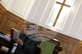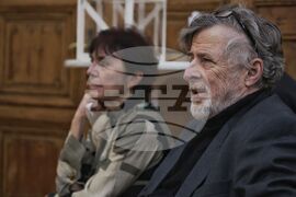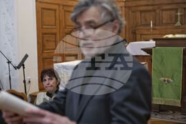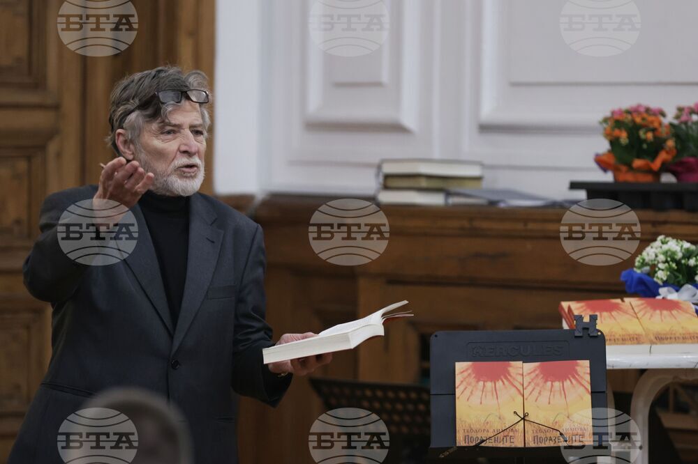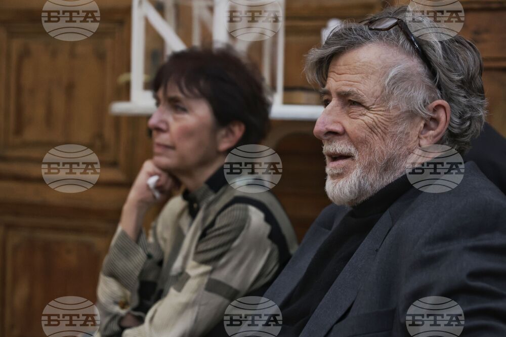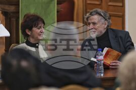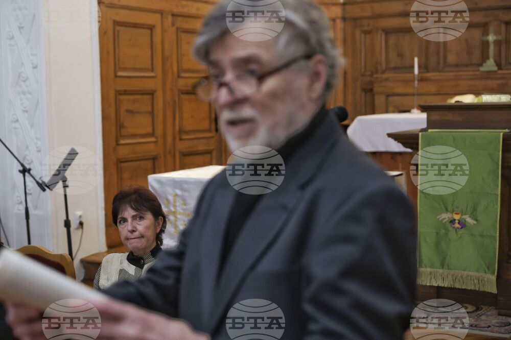 София (1 февруари 2025) Писателят Теодора Димова (вляво) участва в среща-разговор за историята и паметта по повод Деня на признателност и почит към жертвите на комунистическия режим. Домакин на събитието е методистката църква на столичната улица „Георги С. Раковски” 86. На снимката: актьорът Руси Чанев прочете откъси от „Поразените”.