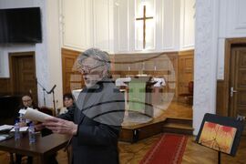 София (1 февруари 2025) Писателят Теодора Димова участва в среща-разговор за историята и паметта по повод Деня на признателност и почит към жертвите на комунистическия режим. Домакин на събитието е методистката църква на столичната улица „Георги С. Раковски” 86. На снимката: актьорът Руси Чанев прочете откъси от „Поразените”.