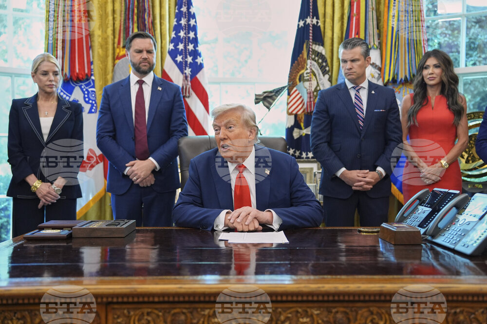 President Donald Trump speaks as he signs executive orders in the Oval Office of the White House, Monday, Aug. 25, 2025, in Washington. Standing with the President from left are, Attorney General Pam Bondi, Vice President JD Vance, Secretary of Defense Pete Hegseth and Homeland Security Secretary Kristi Noem. (AP Photo/Evan Vucci)