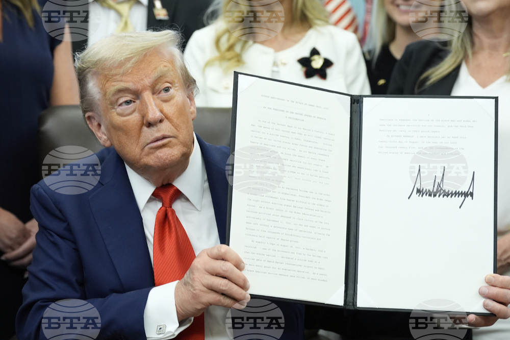 President Donald Trump holds up a signed proclamation honoring the fourth anniversary of the attack at Abbey Gate, in the Oval Office of the White House, Monday, Aug. 25, 2025, in Washington. (AP Photo/Alex Brandon)
