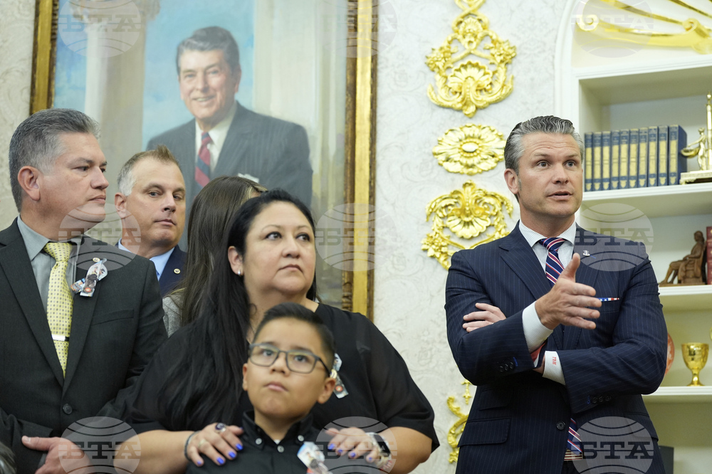 Director of U.S. Federal Marshall Service, Gadyaces Serralta, right, presents President Donald Trump with an honorary badge, as Secretary of Defense Pete Hegseth looks on, in the Oval Office of the White House, Monday, Aug. 25, 2025, in Washington. (AP Photo/Evan Vucci)
