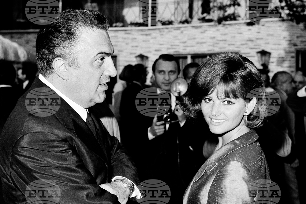 FILE - Italian actress Claudia Cardinale, right, and Italian film director Federico Fellini appear during an Academy Awards ceremony in Rome on May 27, 1964. (AP Photo/Giulio Broglio, File)