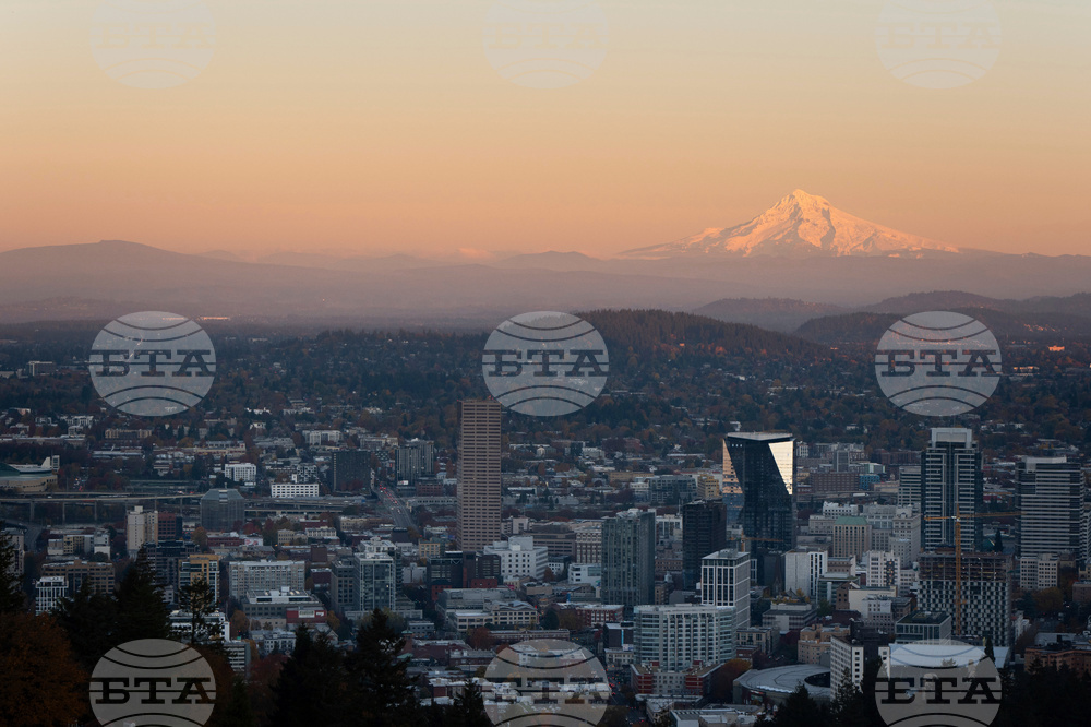 FILE - With Mount Hood in the background, the sun sets over downtown Portland, Ore., on Wednesday, Nov. 6, 2024. (AP Photo/Jenny Kane, File)